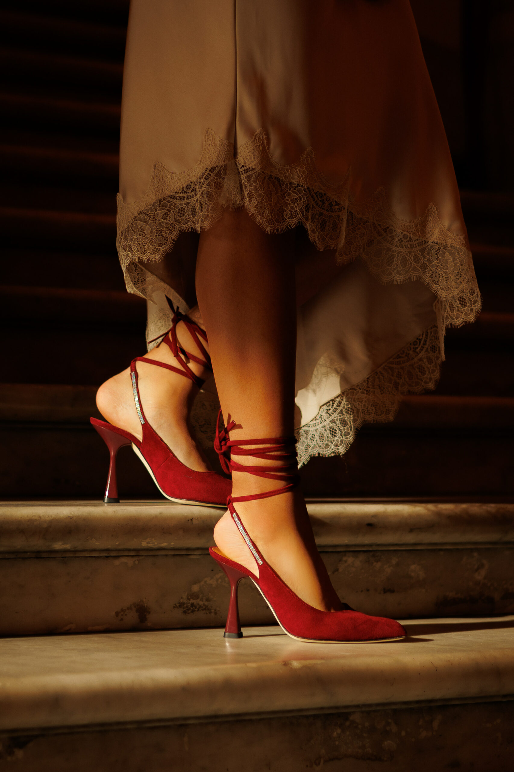 Chaussures en daim bordeaux avec lacet en daim incrusté de strass. Hauteur talon : 9 cm. Talon peint à la main. Semelle intérieure et extérieure en cuir véritable. Disponible du 35 au 42. Modèle en prévente exclusivement pendant un mois, livraison en mars 2026. Possibilité de recevoir un bon cadeau personnalisé de votre achat.